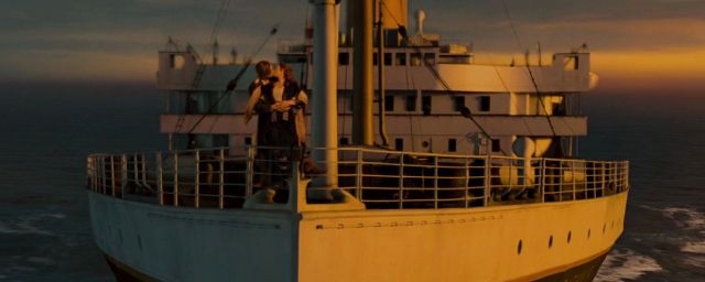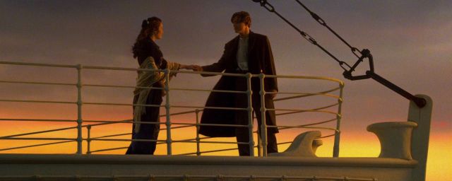 L'une d'elles est bien sûr l'inoubliable premier baiser entre Jack (Leonardo DiCaprio) et Rose (Kate Winslet), sur la proue du paquebot, face à un éblouissant coucher de soleil.