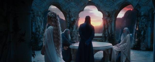 Au milieu du film, la "communauté de Bilbo" arrive dans la vallée d'Imladris, plus connue sous le nom de Fondcombe. Lors de leur séjour sur place, Gandalf participe à un grand conseil avec Elrond, Galadriel et Saroumane. Une scène qui a été très complexe à filmer, comme s'en souvient Peter Jackson dans les bonus du film :