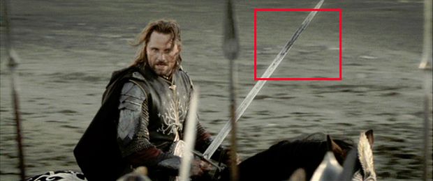 Mais il y a plus ! Lorsqu'Aragorn prononce à cheval son fameux discours, devant la Porte Noire, son épée se noircit soudain, avant que la grande bataille ne commence. Un détail absolument invisible dans la version sortie en salle du film, et pour cause : on ne distingue ce changement que dans la version longue de l'oeuvre ! Cette marque sur l'épée est en fait dû à la décapitation par Aragorn de la Bouche de Sauron, une séquence qui n'apparait pas dans la version finale du film.