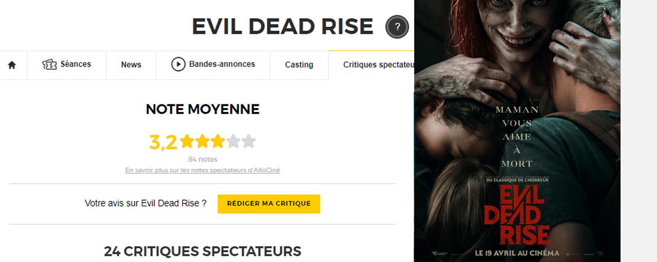 L'internaute au pseudo prédestiné, Evilfun, est dithyrambique et lui met la note maximale. Il écrit : "Vous ne pouvez pas passer à côté ! L'original est culte, le reboot de 2013 bien mené mais là... Vous cesserez de respirer accroché à votre siège. Evil Dead Rise est le changement que l'on attendait. Oppressant jusqu'à la fin, chaque plan, chaque séquence est habillement mise en scène.