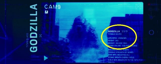Selon les indications qui nous sont furtivement mentionnées, on peut ainsi découvrir que Godzilla (ou Titanus Gojira) mesure 393 pieds, c'est-à-dire environ 119 mètres (11 de plus que dans le film de 2014). S'agissant de son poids, le lézard géant pèse 164 tonnes.