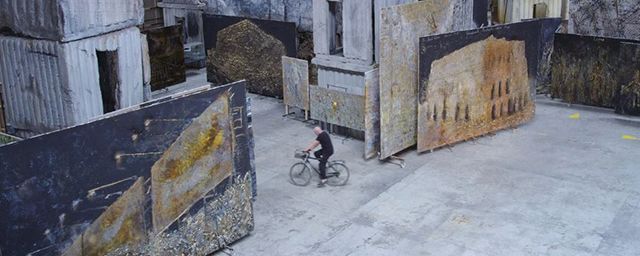 Dans son gigantesque atelier aux allures d’usine, Anselm Kiefer pédale sur son vélo. Il navigue entre ses peintures, les déplace d’un mouvement léger de la main. Entouré d’images, il semble vivre dans un véritable paysage artistique dont il est le créateur.