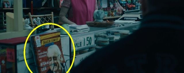 En couverture de la revue exposée près de la caisse - que Venom replace d'ailleurs d'une pichenette - on reconnaît ainsi la moustache blanche et les lunettes de soleil du scénariste, juste à côté du titre suivant : "The amazing career of Stan Lee" ("L'incroyable carrière de Stan Lee"). Un hommage discret mais incontournable à celui qui a donné naissance à de très nombreux héros Marvel tels que Iron Man, Hulk, ou encore les X-Men.