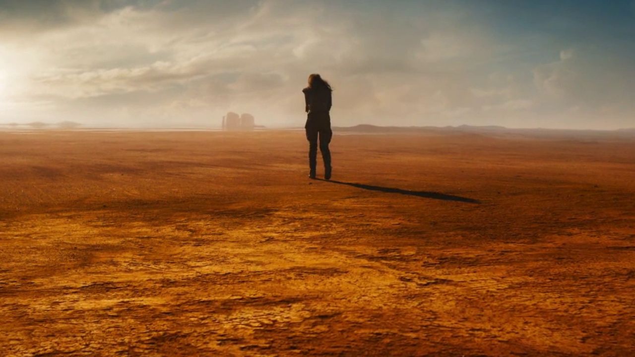 Furiosa apparaît de dos, dans le désert, visiblement perdue et blessée...