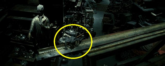 Assez facile à repérer, le clin d'oeil qui nous intéresse ici se trouve à 58 minutes et 2 secondes du dernier film, alors que Harry s'avance tout seul entre les gigantesques piles d'antiquités qui sont entreposées dans la salle. C'est là que vous pourrez voir, perché en haut d'un cadre, l'un des Lutins de Cornouailles que Gilderoy Lockhart avait utilisés lors de son cours de Défense contre les Forces du Mal, dans Harry Potter et la Chambre des secrets.