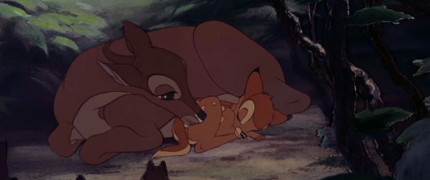 Premier film de la firme présentant des animaux avec une approche réaliste, Bambi est aussi largement passé à la postérité pour une séquence entrée au Panthéon du 7e Art; une des morts les plus tragiques et bouleversantes qui soit : la mère de Bambi, victime d'un chasseur. "Maman... ?" lâche le jeune faon désormais orphelin, avec une voix chevrotante... Avant que le grand prince de la forêt, et ses bois magnifiques, ne surgisse et lui dise : "Ta mère ne sera plus jamais auprès de toi..."