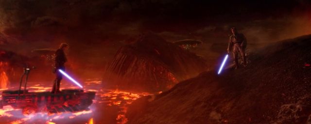 20 ans après, dans La Revanche des Sith (dont l'action se situe donc une génération avant celle du Retour du Jedi), c'est Obi-Wan qui se place en hauteur par rapport à Anakin en sautant d'une plate-forme pour atterrir sur une petite colline, à la fin de leur duel, à 1 heure et 59 minutes.