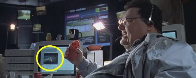 Vous pouvez aussi jeter un œil à la fenêtre qui est ouverte sur le même moniteur, à 54 minutes et 18 secondes du film (voir ci-dessus). Alors qu’un appel vidéo est censé avoir lieu avec la marina d’Isla Nublar, c’est en réalité un simple lecteur vidéo que l’on voit à l’écran : le curseur de la souris est en effet positionné sur le bouton “lecture” !