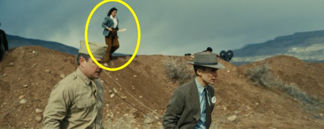 Alors que Oppenheimer et ses équipes arpentent les étendues désertiques de Fort Alamo pour préparer l'essai Trinity (c'est-à-dire le tout premier essai nucléaire de l'Histoire), observez bien votre écran, et tout particulièrement Olivia Thirlby, l'actrice qui suit Cillian Murphy et Matt Damon à une petite distance (voir ci-dessus).