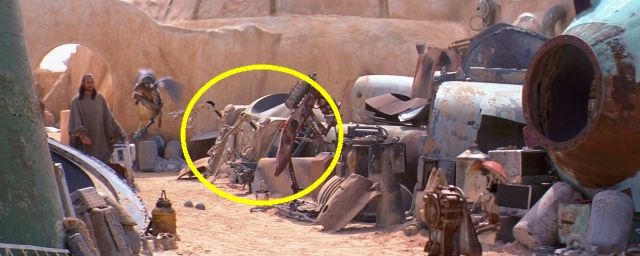 Comme dans toutes les scènes où il est question d'accessoires divers empilés les uns sur les autres, il est conseillé d'ouvrir l'oeil lorsque le maître Jedi arpente les poussiéreuses allées bordées de tas de ferraille. En effet, au centre de l'écran, à droite des personnages, se trouve un objet que les fans de science-fiction ont peut-être reconnu...