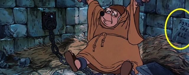 Sur ce plan où Frère Tuck - censé être exécuté à l'aube sur ordre du Prince Jean - est toujours enchaîné dans sa cellule, on peut en effet observer une petite inscription sur le mur.