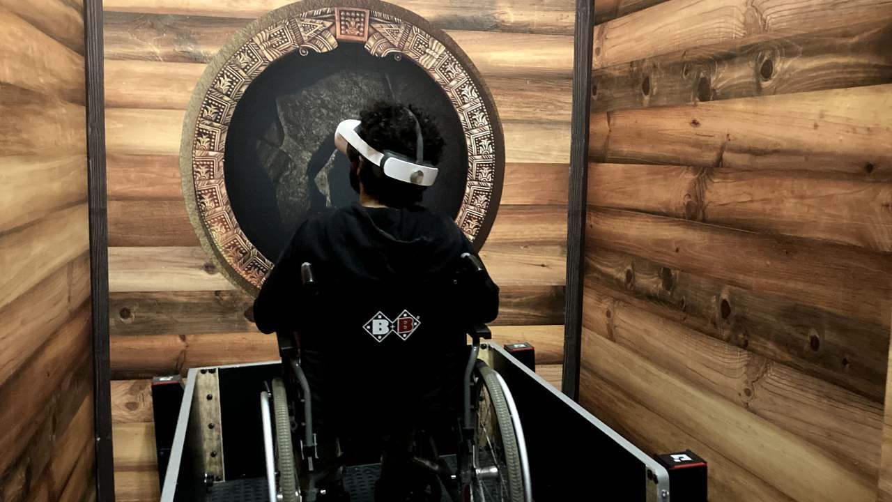 Après avoir testé Uncharted, nous avons aussi pu découvrir l’expérience VR qui s’adresse seulement aux personnes en situation de handicap. Nous découvrons une petite pièce cachée à la sortie de l’attraction avec deux plateaux, sur l’un desquels se trouve un fauteuil roulant.