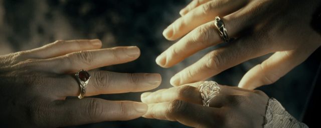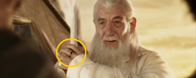 Lorsque vous reverrez le film de Peter Jackson, on vous recommande donc d'appuyer sur pause à 3 heures, 55 minutes et 27 secondes, dans la scène où Gandalf, Bilbon et Frodon se rendent aux Havres Gris pour partir en direction des Terres Immortelles. Lorsque le Magicien se retourne pour faire ses adieux aux Hobbits, observez bien sa main droite, posée sur son bâton, et l'anneau qui se trouve à son majeur.