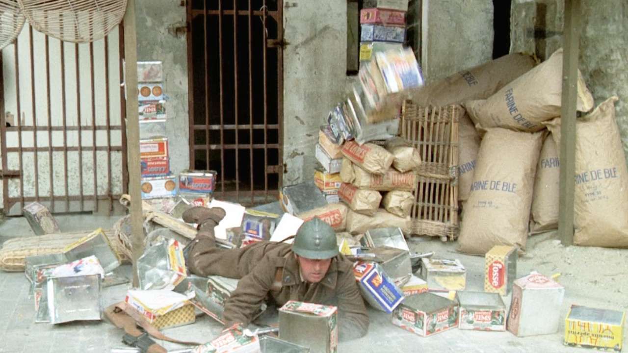 Du moins jusqu'à ce que Pithivier (Jean Lefebvre) ne fasse tomber les conserves derrière lesquelles il était caché et tombe la face la première sur le sol ! Heureusement pour lui, Tassin (Aldo Maccione) est là et tire sur les Allemands, sauvant la vie de son camarade. En se relevant, Pithivier prononce cette phrase mythique - bien que liée à des événements tragiques : "J'ai glissé, chef".