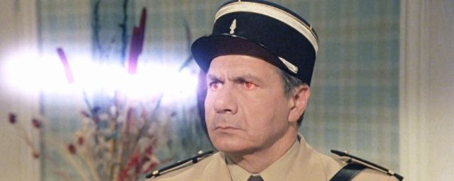 Face à l'incrédulité du gendarme, son visiteur (sous les traits de Michel Galabru, donc) se met donc à lancer des lasers avec des yeux rouges, pulvérisant tous les bibelots de l'appartement.