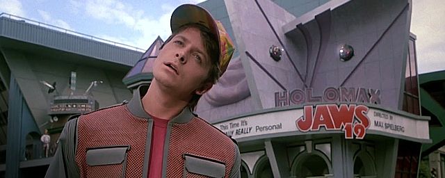 Dans Retour vers le futur II, Marty se retrouve en 2015, une année pleine d’avancées technologiques étonnantes comme les appels vidéo, les télévisions à écran plat et les lunettes intelligentes. Cependant, l’une des scènes les plus mémorables a lieu lorsqu’il tombe sur un hologramme géant représentant un requin, faisant la promotion du film Les Dents de la mer 19. Ce moment, bien que humoristique, cache une critique acerbe de la tendance croissante d’Hollywood à produire des suites sans fin.