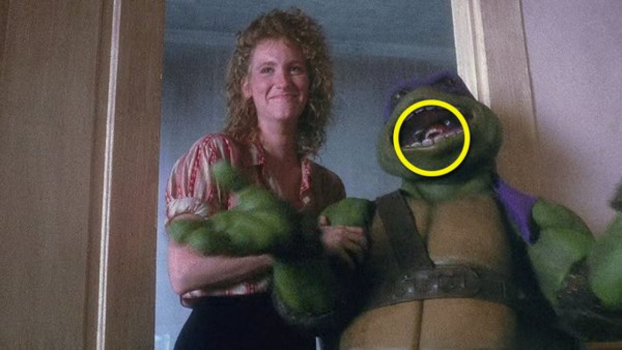 Si vous possédez l'oeuvre en support physique à la maison, faites un arrêt sur image à 54 minutes et 36 secondes. Dans la scène en question, Donatello et April O'Neil se réjouissent du retour en forme de Raphaël, mis K.O. quelques séquences plus tôt lors d'une bagarre avec le terrible clan des Foot.