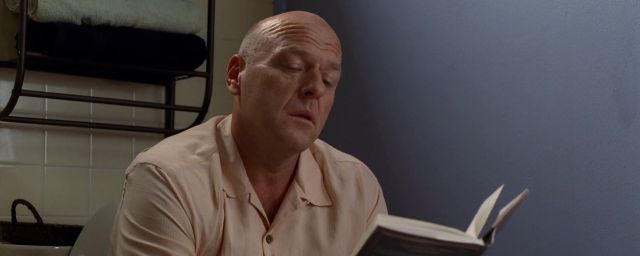 Cette fois, c'est Hank qui est sur le trône et qui, pour tuer le temps, s'empare du premier livre qu'il trouve, juste derrière lui. Ce livre, ainsi que le comprennent avec horreur et stupéfaction les téléspectateurs, est celui que Gale Boetticher (l'ancien comparse de Walt) avait offert et dédicacé à son mentor. L'ouvrage est signé Walt Whitman, et le message manuscrit qui apparaît sur la page de garde est le suivant :