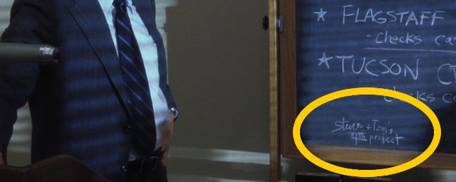 Alors que Carl est en train d'exposer à ses hommes un nouveau cas d'escroquerie, observez bien le coin inférieur gauche du tableau noir, juste à droite du personnage. Si vous arrêtez l'image au bon moment, vous pourrez distinctement lire les mots suivants : "Steven & Tom's 4th project".