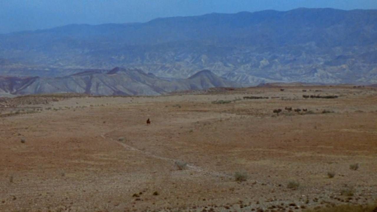 Au loin, un cavalier avance tranquillement dans le désert. Le silence de la scène est brisé par un sifflement détendu d'une personne dont on devine qu'elle est proche de nous, sur une hauteur, en train d'observer le cavalier. Ce dernier poursuit son avancée au pas, et les sifflements continuent. Quand soudain, un bruit retentit.