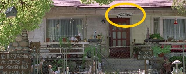 Dans la lignée exacte de l'humour qui fait le sel de la trilogie Retour vers le futur, cette séquence hilarante nous donne deux informations de taille : Biff habite chez sa grand-mère, et cette dernière se nomme... Gertrude Tannen (ainsi que nous l'apprend un autre petit écriteau suspendu au-dessus de la porte d'entrée).