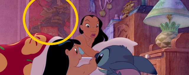 Mais c'est au mur de la chambre, juste derrière Nani, que l'on va s'intéresser ici. En un simple clin d'oeil, vous devriez être capables de deviner quel est son classique Disney préféré, étant donné qu'elle dort juste à côté d'un grand poster officiel de Mulan (sorti 4 ans seulement avant Lilo et Stitch).