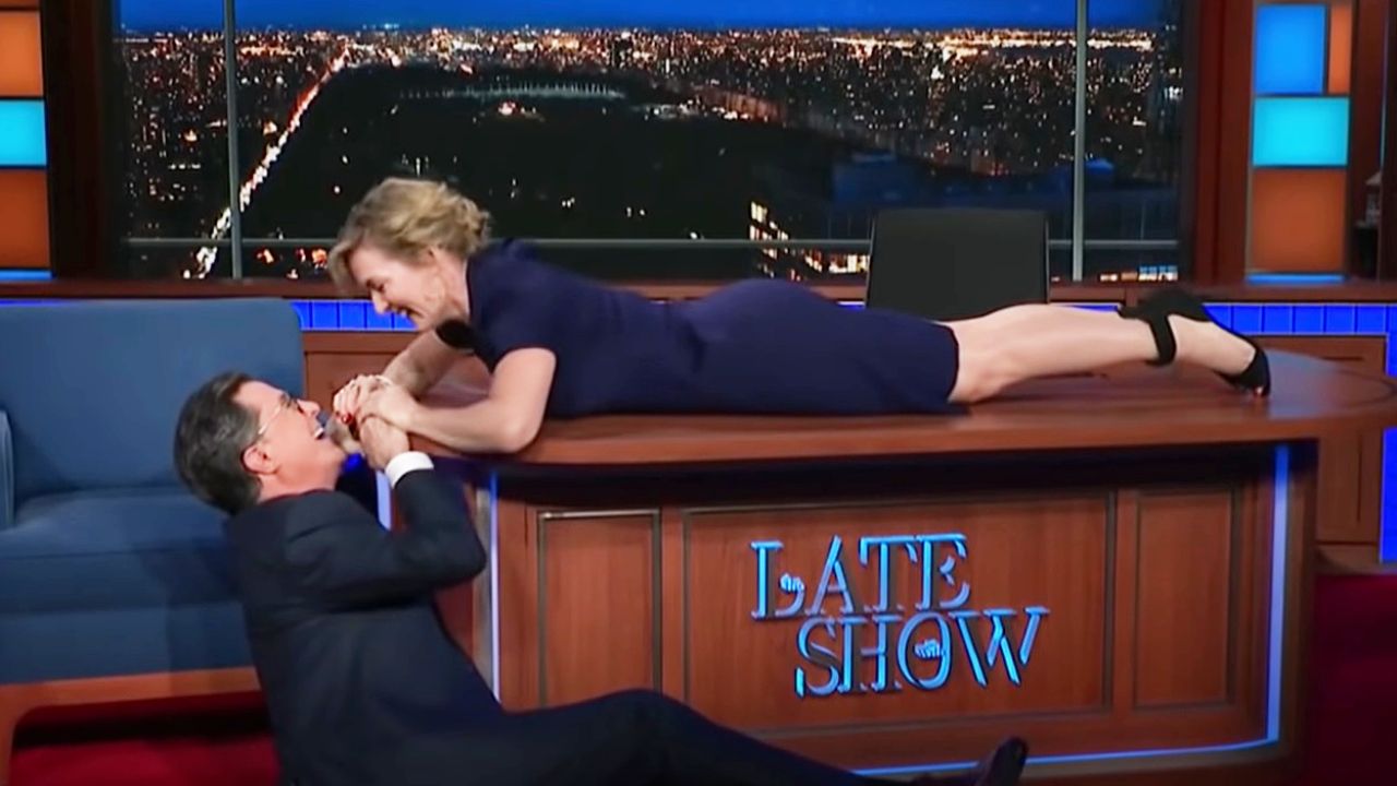 "YEAH, ON l'A FAIT !", s'écrie-t-elle, laissant Stephen Colbert conclure l'émission, allongé tête-bêche aux cotés de la comédienne. Ce programme a été diffusé il y a 7 ans, mais la controverse de la porte en bois continue de faire parler.