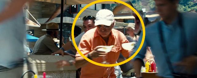 En effet, si vous appuyez sur pause à 1 heure, 19 minutes et 50 secondes du film, durant la scène où les dinosaures volants sont libérés dans le parc et s'attaquent aux visiteurs, vous devriez pouvoir apercevoir (l'espace d'une seconde) un homme vêtu d'une chemise saumon, coiffé d'une casquette blanche et tentant de fuir en transportant avec lui deux margaritas.