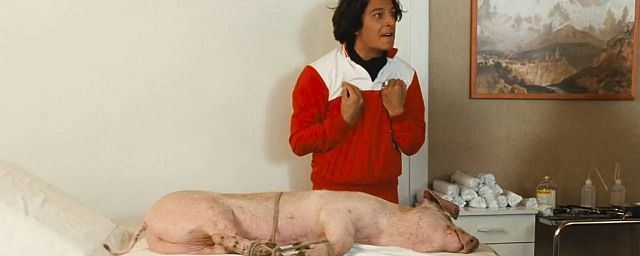 “Cette énorme bête avait (...) été apportée cachée dans une malle à costumes. Et il fallait qu’on soit rapides car le vétérinaire nous avait dit qu’au bout d’une heure et demie, le cochon allait se réveiller et qu’il valait mieux pour nous qu’on ait terminé de tourner ! C’est dire si on était speed, en tout cas moi !”