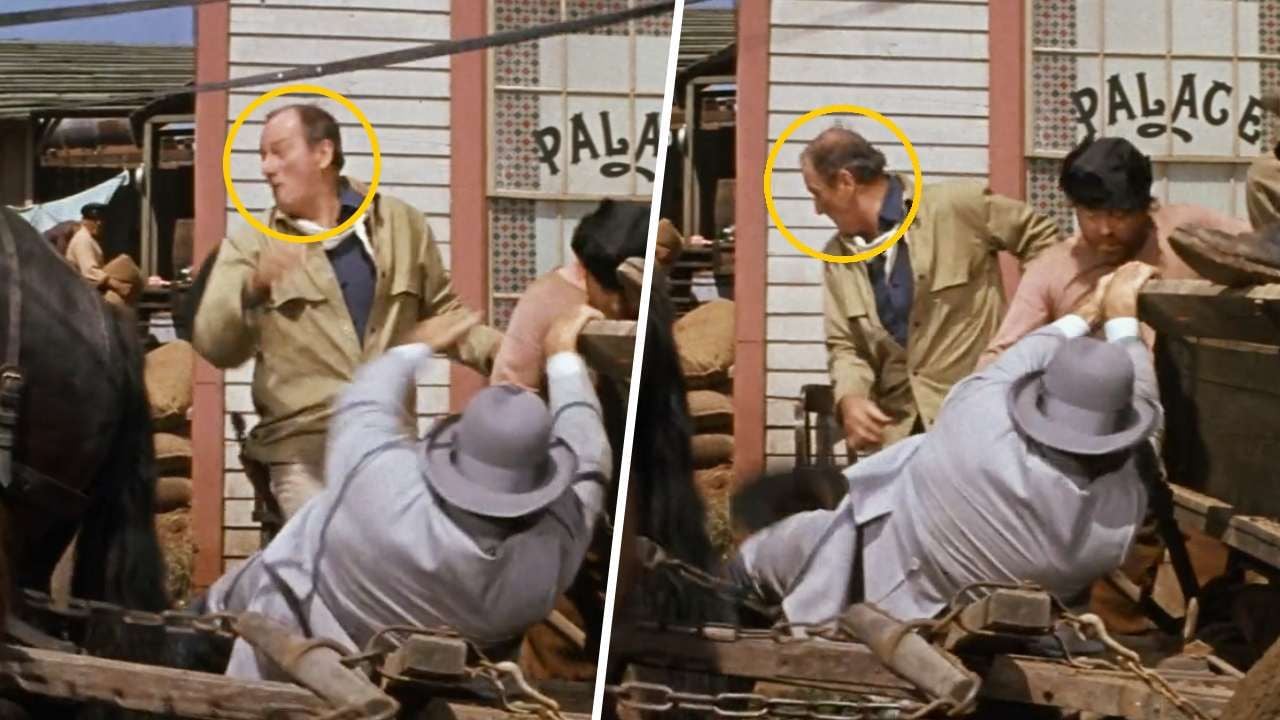 Vers la fin du film, Sam (John Wayne) tente d'empêcher l'escroc Frankie Canon (Ernie Kovacs) de prendre la fuite et ce dernier lui colle une droite bien sentie. Et avec un arrêt sur image, on peut nettement voir que le chapeau de John Wayne tombe, emportant avec lui la perruque qui ne le quittait que rarement et révélant au public sa calvitie. On peut voir la séquence au ralenti ici :