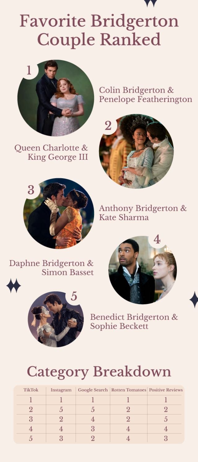 L'étude a analysé les cinq couples actuels de Bridgerton à travers cinq critères pondérés de manière égale : l'engagement TikTok (nombre de vues des hashtags), l'activité Instagram (nombre de posts), le volume de recherches Google, les notes Rotten Tomatoes et le pourcentage d'avis positifs du public. On obtient ainsi un classement mondial objectif qui fait fi des guéguerres de fans sur les forums.