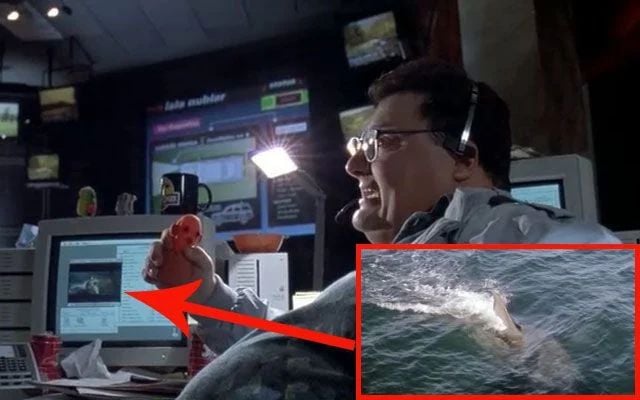 Bien sûr, comme Jurassic Park, Les Dents de la mer était produit par Universal, ce qui permettait de mettre des images du film de requins sans avoir à payer de droits à un autre studio, mais le choix de ce long métrage précis n'est pas du tout un hasard.