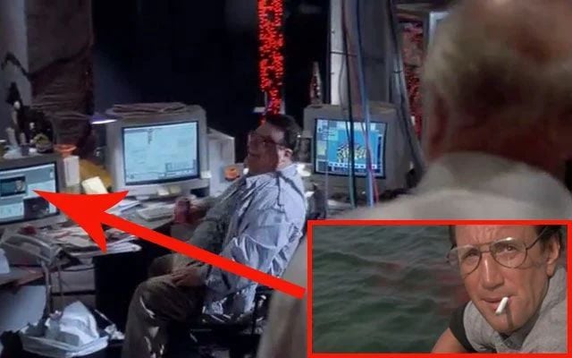 Dans le film, on peut voir sur le bureau du programmeur informatique Dennis Nedry (Wayne Knight) plusieurs écrans d'ordinateur dont un sur lequel un petit lecteur vidéo est en train de tourner. On peut alors apercevoir en zoomant sur le lecteur vidéo qu'il diffuse un film bien connu : Les Dents de la mer.
