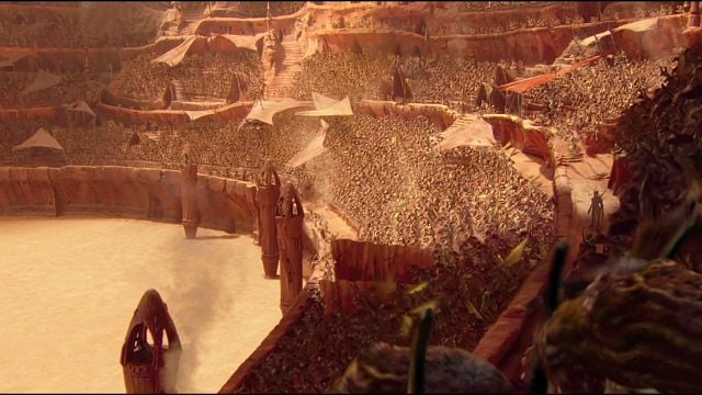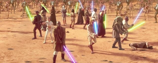 Mais pour l'heure, chaque fan qui découvre L'Attaque des Clones dans son fauteuil de cinéma a les poils au garde-à-vous. En effet, pour la première fois dans l'Histoire de Star Wars, une véritable armée de Jedi fait son apparition. Alors qu'une forêt de sabre laser fait progressivement scintiller les gradins de l'arène, une lutte farouche s'engage entre les Chevaliers de la galaxie et les droïdes de la Confédération.