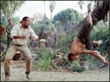 (Rires) C'est vrai, et ce n'était pas agréable ! (Rires) Il ne faisait même pas 1m50 mais quelque chose comme 1m20 ! Ces gars là étaient incroyables... Vous savez, personnellement, j'en ai marre de toujours voir des héros qui fracassent tout le monde, comme Superman. Je déteste ça. Pour moi, si vous devez être le héros du film vous devez avoir des défauts, des failles et vous mettre en position de danger. J'aime beaucoup le fait que mon personnage soit un costaud, un chasseur de primes qui fait ce qu'il a à faire et qui sait s'imposer. Mais dans cette jungle, il est comme un poisson hors de l'eau et ces petits pygmés qui mesurent 1m20 me bottent les fesses... J'ai adoré ! (rires)