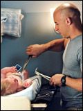 (Rires) Bien sûr ça m'a pris un peu de temps avant de maîtriser la danse de Peter Panda... Mais pas tant que ça parce que dans cette scène, vous chantez et vous dansez pour le petit garçon qui est là. Regardez comme il est mignon ce petit ! (Il se tourne et le pointe sur l'affiche du film) C'est sûr que si j'interprétais cette danse sans aucune raison, ce serait stupide et ridicule dans le film. Mais je le fais parce que c'est ce dont a besoin ce gamin pour s'endormir ! (Rires) Et le fait qu'il soit mon public privilégié ma beaucoup aidé, car même le plus impressionnant des gros bras devient gaga au contact d'un bébé... Vous devenez vraiment gaga, vous faites des trucs stupides, vous faites tout pour que le bébé rigole... Et dans le cas précis de cette scène, le petit garçon devait me regarder à la fin et me dire "Papa". Donc la scène est entièrement écrite pour arriver à ce résultat... Mais c'était très marrant en tout cas.