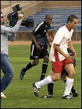 Je me suis entraîné pendant quatre mois. Vous avez raison, je ne suis pas un professionnel. Le foot, pour moi, c'était avec des copains dans la rue, en tapant dans une balle en mousse et en se servant d'un mur pour faire le but ! Il a donc fallu bosser dur pour que j'ai l'air d'un vrai pro. Tellement dur que je me suis cassé la cheville pendant cet apprentissage et que cela a failli me coûter le film. C'était vraiment très physique. En plus de la cheville, je me suis quand même aussi cassé le nez, et j'évite de vous parler de tous les petits coups que j'ai encaissé au quotidien ! (rires)