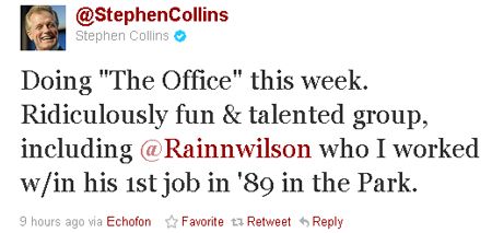 No Ordinary Family, Brothers & Sisters, Private Practice, The Three Stooges... et maintenant The Office ! Depuis un an, l'agenda de Stephen Collins est plein à craquer ! L'ex-révérend Camden de 7 à la maison vient en effet de débuter le tournage d'un épisode de la saison 8 de la comédie de NBC, dans lequel il interprète le père d'Andy Bernard (Ed Helms), et qui devrait être diffusé dans le courant du mois d'octobre. C'est Collins en personne qui l'a annoncé via Twitter