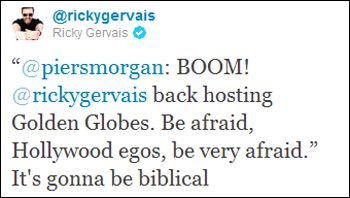 Grand amateur du réseau social Twitter, Ricky Gervais a lui aussi commenté la nouvelle sur son compte, en conversant notamment avec son ami, le présentateur Piers Morgan :