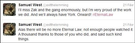 Premier tweet (en partant du bas) : "Hélas, c'en est fini d'Eternal Law; pas assez de gens l'ont regardée. Un millier de remerciements à ceux qui la suivaient et qui nous témoignaient leur soutien."
