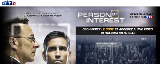 A l'occasion du lancement de Person of Interest sur TF1, MYTF1.fr propose une enquête interactive évènementielle. Pour cela, il suffit de décrypter les codes de la "Machine", ce qui permettra d'accéder chaque semaine à une vidéo exclusive. Les téléspectateurs ont 72h après la diffusion d'un épisode pour résoudre le mystère, avant que la vidéo ne s'efface définitivement du serveur. Le premier défi a déjà débuté et exceptionnellement laisse jusqu'au démarrage de la série, le 6 mars à 20h50, pour cracker le code 0. Toutes les semaines, un nouveau code sera à déchiffrer...