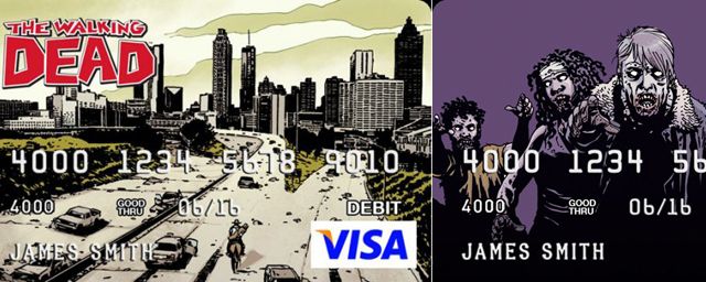 Déjà présents sur les écrans et dans les comic books, les célèbres survivants d'Atlanta et les insatiables zombies s'invitent également sur les cartes bancaires. Robert Kirkman, créateur de la bande-dessinée et superviseur de la série The Walking Dead, a annoncé un partenariat avec le site Card.com pour plusieurs cartes VISA à l'effigie du comic. Survivants, décors, zombies, tout est disponible pour donner une touche morbide à cet objet incontournable de la vie quotidienne. Kirkman a déclaré qu'"avoir des dessins de 'The Walking Dead' sur leur carte de crédit est un moyen excitant pour les fans d'ancrer un peu plus la série dans leur vie."