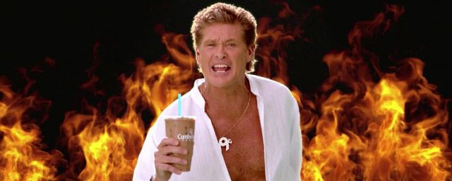 David Hasselhoff a atteint un tel degré d'auto-dérision qu'il a sans doute déjà quitté notre monde "réel". L'ex star de K 2000 et Alerte à Malibu a multiplié les apparitions décalées, les clins d'oeil ironiques et a toujours accueilli les citations parodiques avec bon esprit. Son dernier méfait médiatique est une publicité destinée à promouvoir un thé glacé de la chaîne Cumberland Farms. Une courte vidéo, d'à peine une minute, dans laquelle il boit le délicieux breuvage entouré de naïades, chante devant un mur de feu, montre son torse encore parfaitement sculpté et fait du deltaplane en arborant un grand sourire... Impossible ? Pas pour "The Hoff"...
