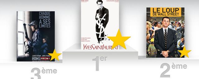 Le biopic Yves Saint Laurent, avec Pierre Niney dans le rôle du célèbre couturier, s'installe en tête du box-office hebdomadaire avec plus de 550 000 entrées. Le Loup de Wall Street rétrograde du coup à la deuxième place du classement mais résiste remarquablement bien avec encore près de 385 000 nouveaux spectateurs en troisième semaine d'exploitation et un cumul proche des 2,1 millions de billets vendus. Le film est désormais le quatrième plus grand succès de Martin Scorsese dans l'hexagone derrière Gangs of New York (2,26 millions d'entrées), Taxi Driver (2,7) et Shutter Island (3,1).