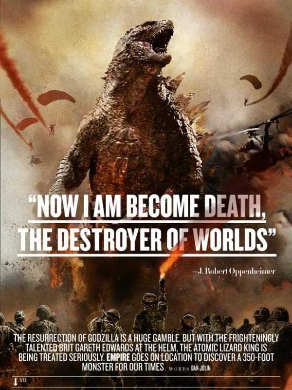 La bande-annonce révélée cette semaine a rassuré les inquiets et fait (encore plus) saliver les impatients... Le Godzilla de Gareth Edwards est bel et bien un des événements ciné de ce début d'année 2014. Le magazine Empire ne s'y est pas trompé en faisant la Une avec le film, dévoilant au fil de ses pages des nouveaux clichés, dont un (ci-dessus) qui permet d'évaluer la "bêbête". Cliquez ici pour voir l'intégralité des photos. Godzilla sort en salles le 14 mai 2014.
