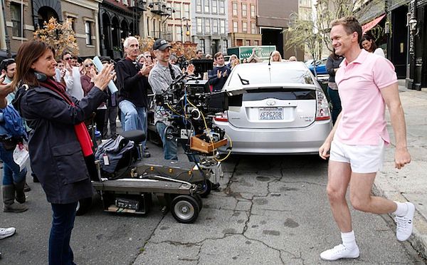 La réalisatrice Pamela Fryman applaudissant Neil Patrick Harris, qui vient de boucler sa dernière scène.