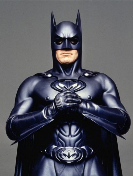 Côté Créa, tout comme son prédécesseur Val Kilmer, George Clooney héritera de deux costumes. Pour le premier, exit les reflets métal argenté, place à un costume qui lorgne vers le bleu nuit. On récupère au passage les tétons du premier costume de Val Kilmer. "Ils voulaient qu’il fasse humain, et en même temps très animal. Et joel a adoré l’idée d’avoir les mamelons !", expliquera plus tard Randy Gardell, Costume Coordinator sur le film. On passe aussi à un look assez uniforme : le jaune emblématique du costume disparaît, aussi bien au niveau de l'emblème posé sur la poitrine que sur la ceinture.