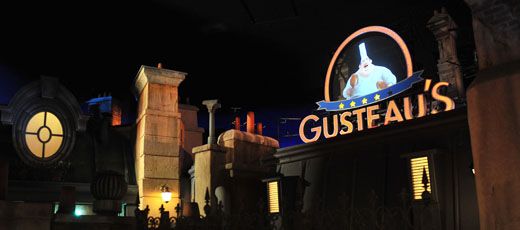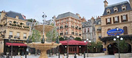 Passée une magnifique arcade en marbre sculptée en forme de Gusteau (souvenez-vous, le chef cuistot qui avait inspiré à Rémy sa passion de la cuisine), on arrive donc sur la fameuse place… Et la magie opère instantanément : un petit quartier directement inspiré par ceux de la capitale française, des enseignes de restaurants qui trônent fièrement sur les façades, une belle fontaine faite de rats et de bouteilles de champagne au milieu, et partout, un avant-goût de succulent repas.