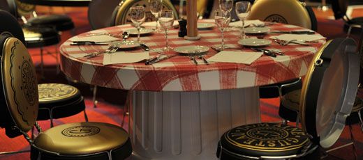 Là encore, le sens du détail est de rigueur, et le décor de la salle est tellement réussi qu’on peut finir par en oublier son assiette. Toujours à la taille de Rémy, on s’assoit à une table faite en boite de conserve, sur une chaise en bouchon de champagne, on marche entre bouteilles de vins et livres de recettes, et on est éclairés par des bougies installées dans des cuillères.
