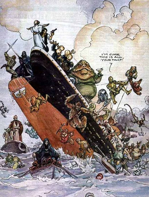 Ci-dessous, le chouette dessin que George Lucas fit paraître dans le Hollywood Reporter en 1997, alors que Titanic venait de battre le record détenu jusque-là par Star Wars. Fair-Play et classe.